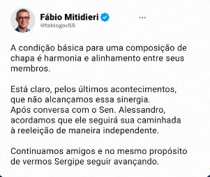 Apesar da tensão evidente, as lideranças envolvidas afirmam manter uma relação respeitosa e reforçam o compromisso com o desenvolvimento do estado. No entanto, a pergunta que ecoa nos bastidores é se o rompimento representa apenas um ajuste estratégico ou o início de uma disputa mais profunda dentro do grupo que hoje comanda Sergipe.