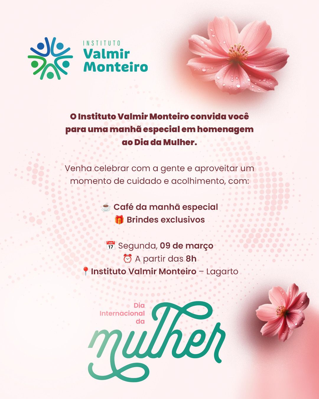 O encontro será realizado na segunda-feira, dia 9 de março, a partir das 8h, na sede do Instituto Valmir Monteiro, em Lagarto. A programação contará com café da manhã especial, momentos de acolhimento e entrega de brindes, em um ambiente preparado para celebrar a força, a importância e o protagonismo das mulheres na sociedade.